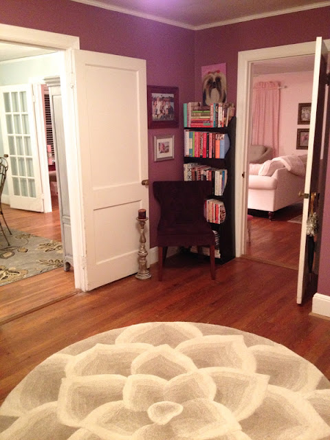 My deep purple hall/library is fab, but far from finished in these first photos. We need a couple more bookcases, which have to be custom made because they must be narrow in width, and a chair to sit in for when you’re thumbing through books. And I decided I needed a different rug. I painted this room, which is really the central hall but doubles as a library (what else can you do with a room that has six doorways?), that lovely purple color when I lived here before and still absolutely love it.